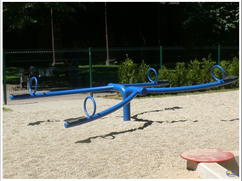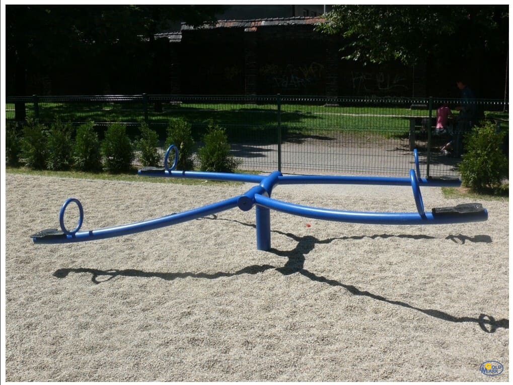 Huśtawka wagowa oparta jest na centralnym, stalowym słupie, z którego wychodzą dwa zakrzywione ramiona, każde zakończone parą ergonomicznych stanowisk do siedzenia.
