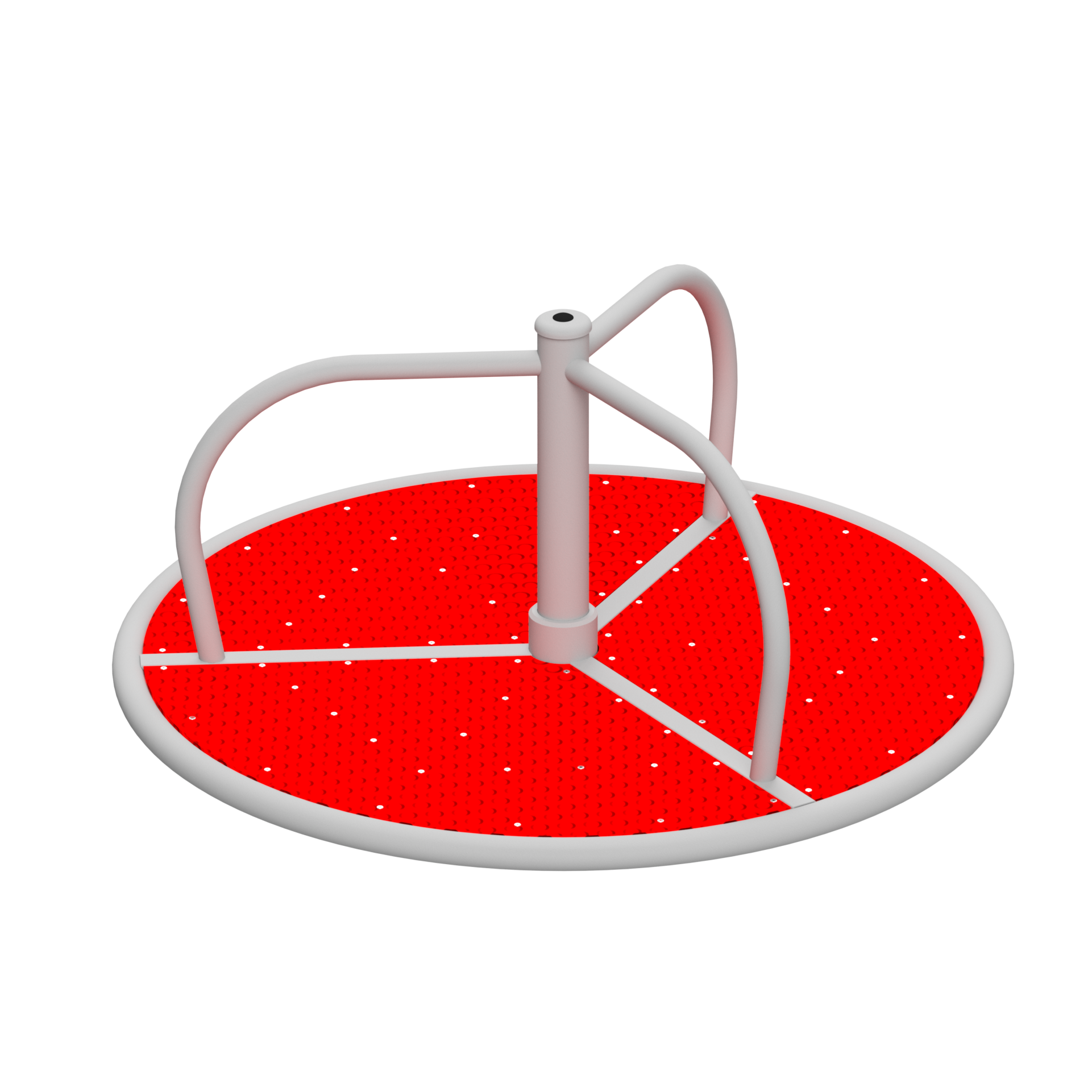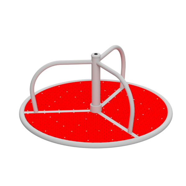 Podłoga karuzeli wykończona jest polietylenową płytą antypoślizgową z wyraźnymi wypustkami guzikowymi, które gwarantują bardzo dobrą przyczepność nawet przy dynamicznym ruchu karuzeli czy złej pogodzie. Materiał ten jest wytrzymały, odporny na warunki atmosferyczne i przyjazny w dotyku, dzięki czemu karuzela może być użytkowana bezpiecznie przez cały rok.