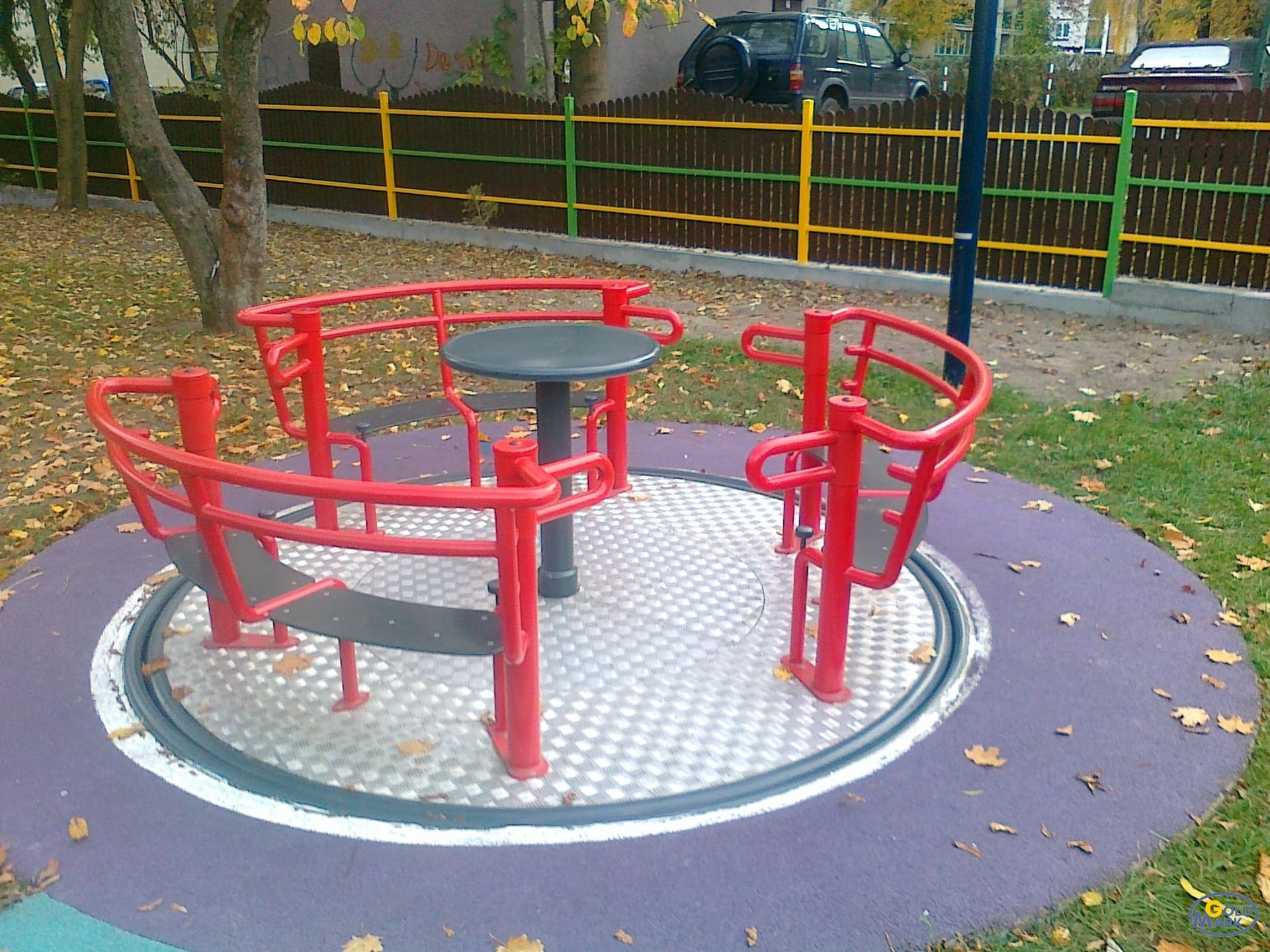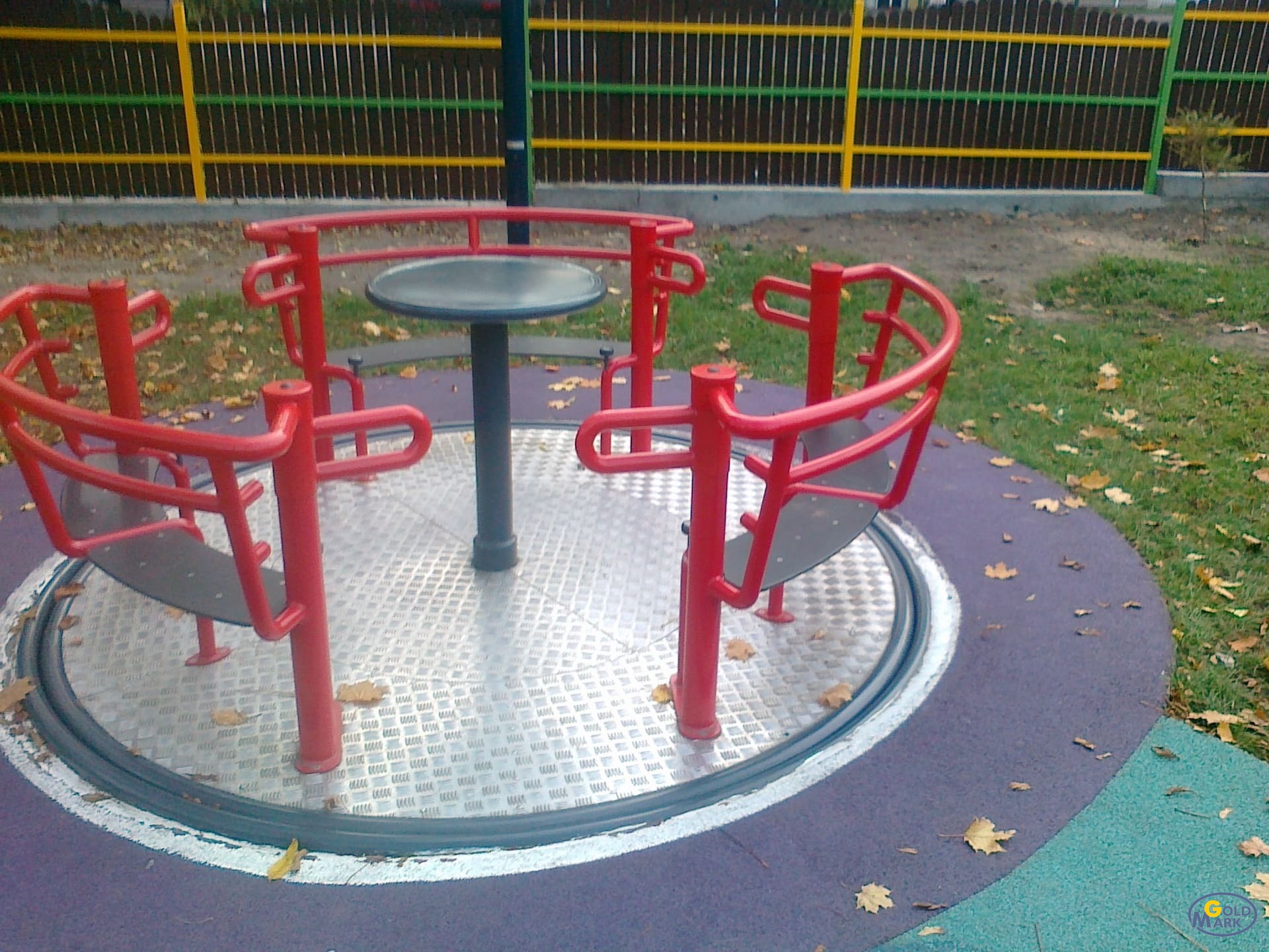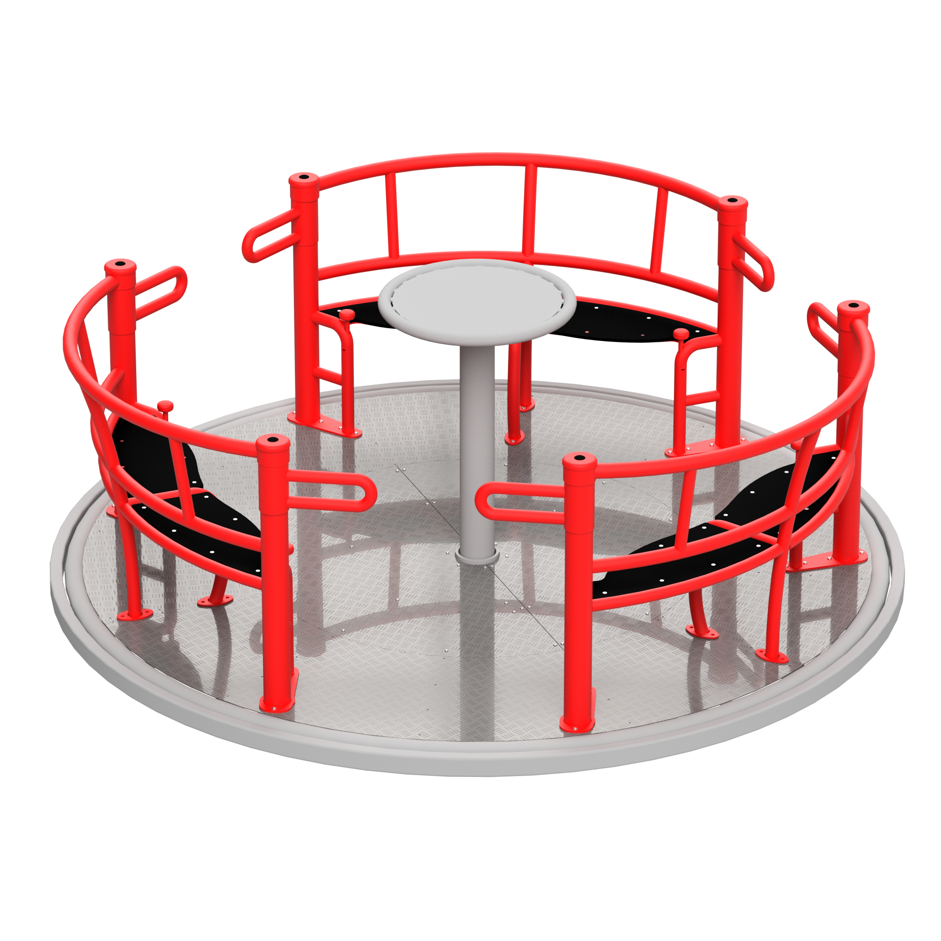 Elementy stalowe karuzeli zostały zabezpieczone antykorozyjnie oraz malowane proszkowo, co zapewnia wysoką trwałość, odporność na warunki atmosferyczne oraz estetyczny wygląd przez długi czas użytkowania.