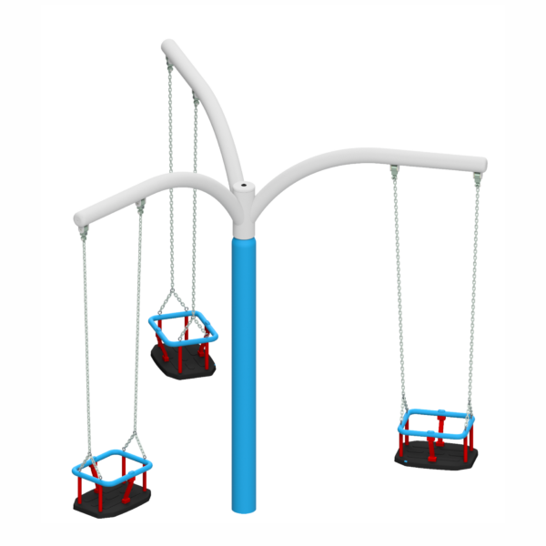 Taku 3 to nowoczesna, trójramienna karuzela słupowa zaprojektowana przez nas z myślą o najmłodszych użytkownikach, łącząca funkcję huśtawki i karuzeli.