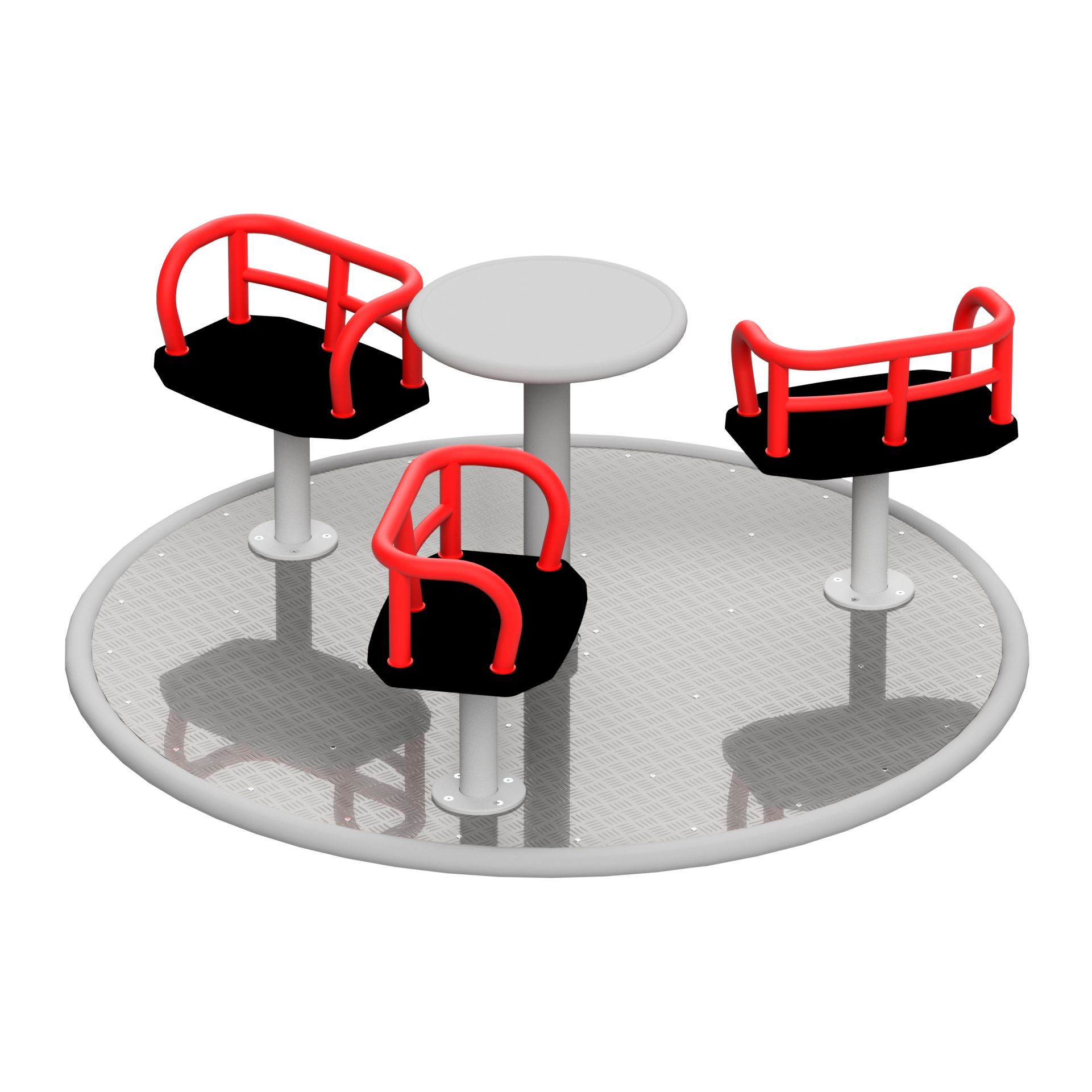 Model został wyposażony w trzy ergonomiczne siedziska w formie krzesełek przykręconych do tarczy karuzeli oraz centralnie umieszczoną kierownicę, która umożliwia dzieciom samodzielne wprawienie karuzeli w ruch i kontrolowanie tempa obrotów. Takie rozwiązanie sprzyja aktywności fizycznej, rozwijaniu siły, koordynacji i współpracy między uczestnikami zabawy.