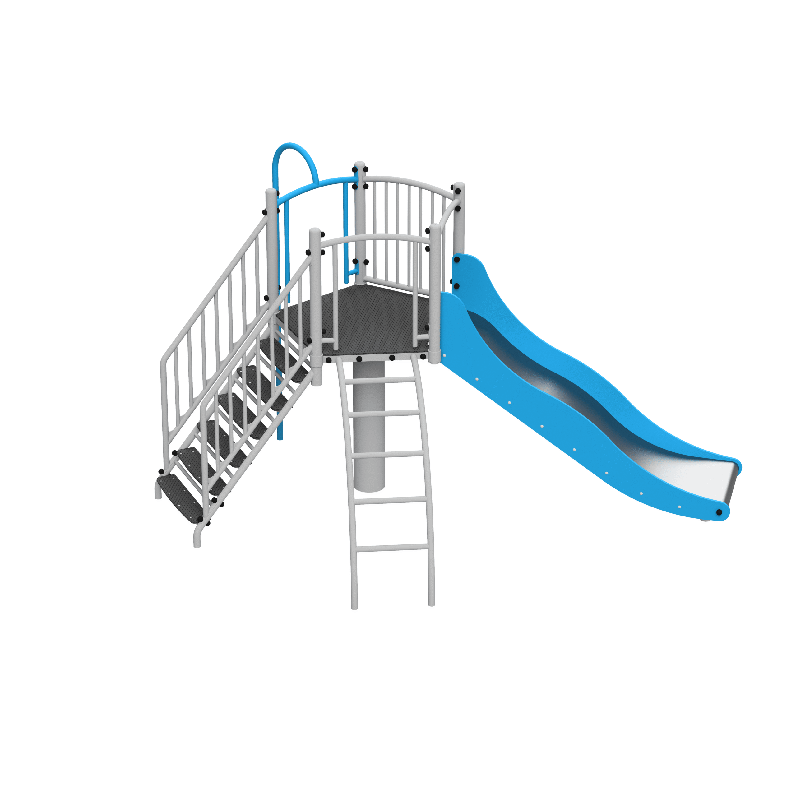 Na podest prowadzi specjalnie zaprojektowane, zabudowane wejście w formie schodków z barierkami, które zapewniają najmłodszym użytkownikom maksymalny poziom bezpieczeństwa- to rozwiązanie idealne dla maluchów, które potrzebują stabilnego, intuicyjnego sposobu wchodzenia. Uzupełnieniem zestawu są dwa elementy rozwijające sprawność i odwagę: rura strażacka oraz wypukła drabinka metalowa, zachęcające do aktywności ruchowej i eksploracji.