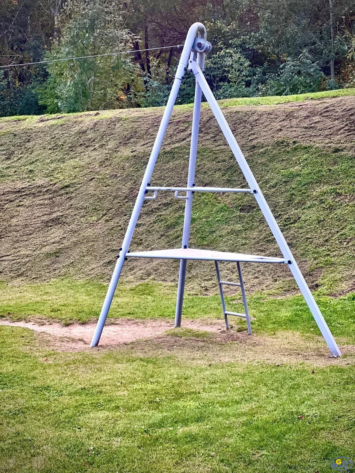 Platforma startowa to antypoślizgowa płyta z aluminium ryflowanego, do której prowadzi bezpieczna drabinka ze stali galwanizowanej. Użytkownicy korzystają z trwałego, ergonomicznego siedziska z gumy EPDM, zawieszonego na solidnym łańcuchu stalowym, które zapewnia wygodę i stabilność podczas jazdy. Zjazd kończy się na wytrzymałym odbojniku ze stali nierdzewnej, który bezpiecznie i skutecznie wyhamowuje wózek.